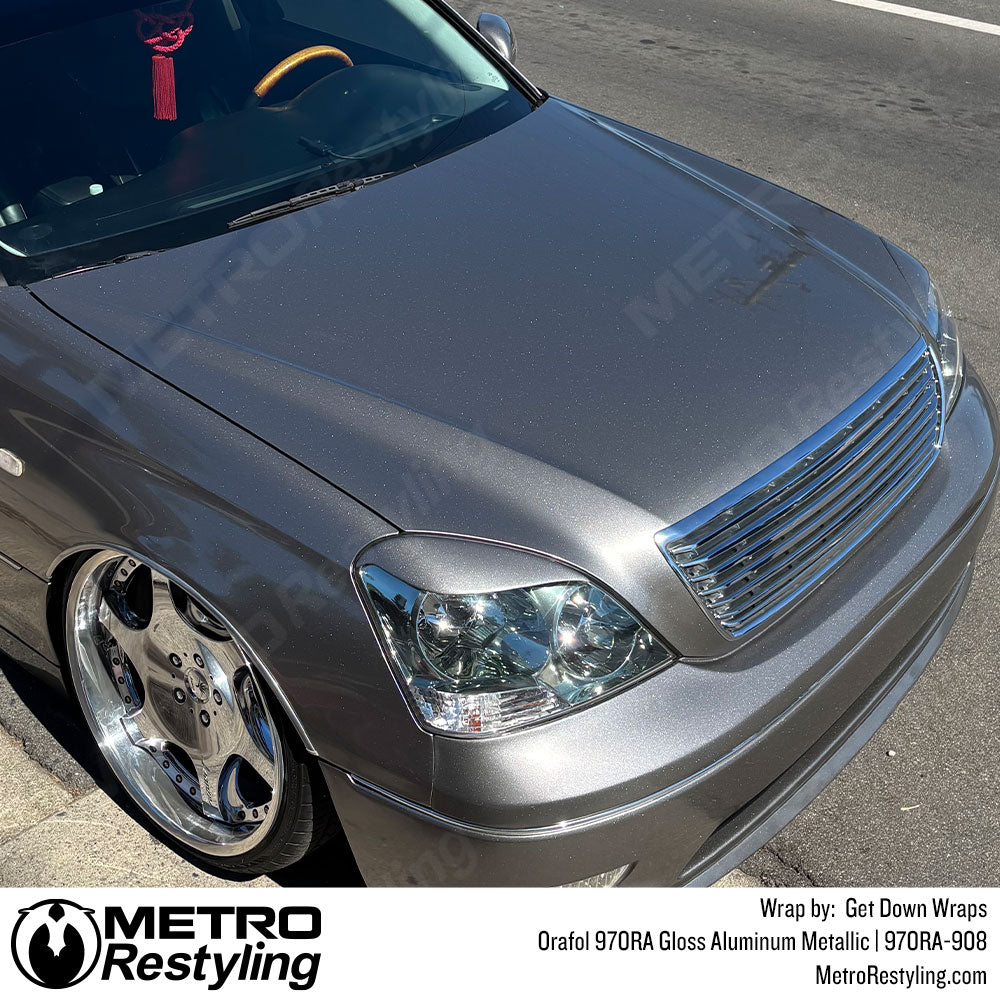 Orafol Series 970RA Gloss Aluminum Metallic vehicle wrap with Rapid Air technology is recommended for full car and truck wraps. Orafol in Gloss Aluminum Metallic can apply to your vehicle's hood, trunk, roof, mirrors, door handles, glass, interior trim and dash panels, chrome and metal parts, motorcycle parts, and just about any relatively non-porous surface.
