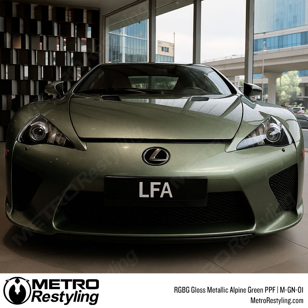 RGBG Gloss Metallic Alpine Green Colored PPF embodies power and precision with its deep metallic-green tone and refined anodized-inspired sheen. The high-gloss surface enhances every body line with smooth, reflective contrast, delivering a look that’s both industrial and elegant. Perfect for those who appreciate bold sophistication, this finish captures the balance between performance and luxury.